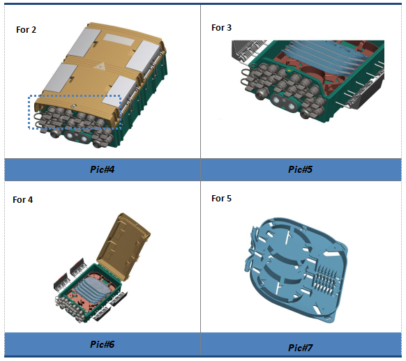 1. The body is made of high quality engineering plastic with good strength. 2. With safe special-shaped lock, the box can be opened easily and has good water-proof performance, suitable for indoor and outdoor natural environments (Pic#4 for details). 3. With water-proof adapter, the box can be operated more conveniently ( Pic#5 for details). 4. With double-page design, the box can be installed and maintained easily, . the fusion and termination are completely separated ( Pic#6 for details). 5. The drop leaf can be installed 5 pcs of 1*8 tube splitter ( Pic#7 for details). Pictures for reference: Package Information 1. Plastic bag size: 500*410mm 2. Inner box with single corrugated size: 365*220*130mm 3. Carton with double corrugated size: 495*380*665mm(10PCS/Box) 4. Weight per carton:22 KG